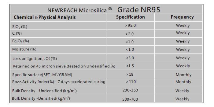 Newreach Microsilica NR95 is dry silica fume available in two main forms:NR-95U,NR-95D. Newreach Microsilica Chemical composition and phtsical properties are regularly tested by SGS and Newreach Laboratory with international standards.